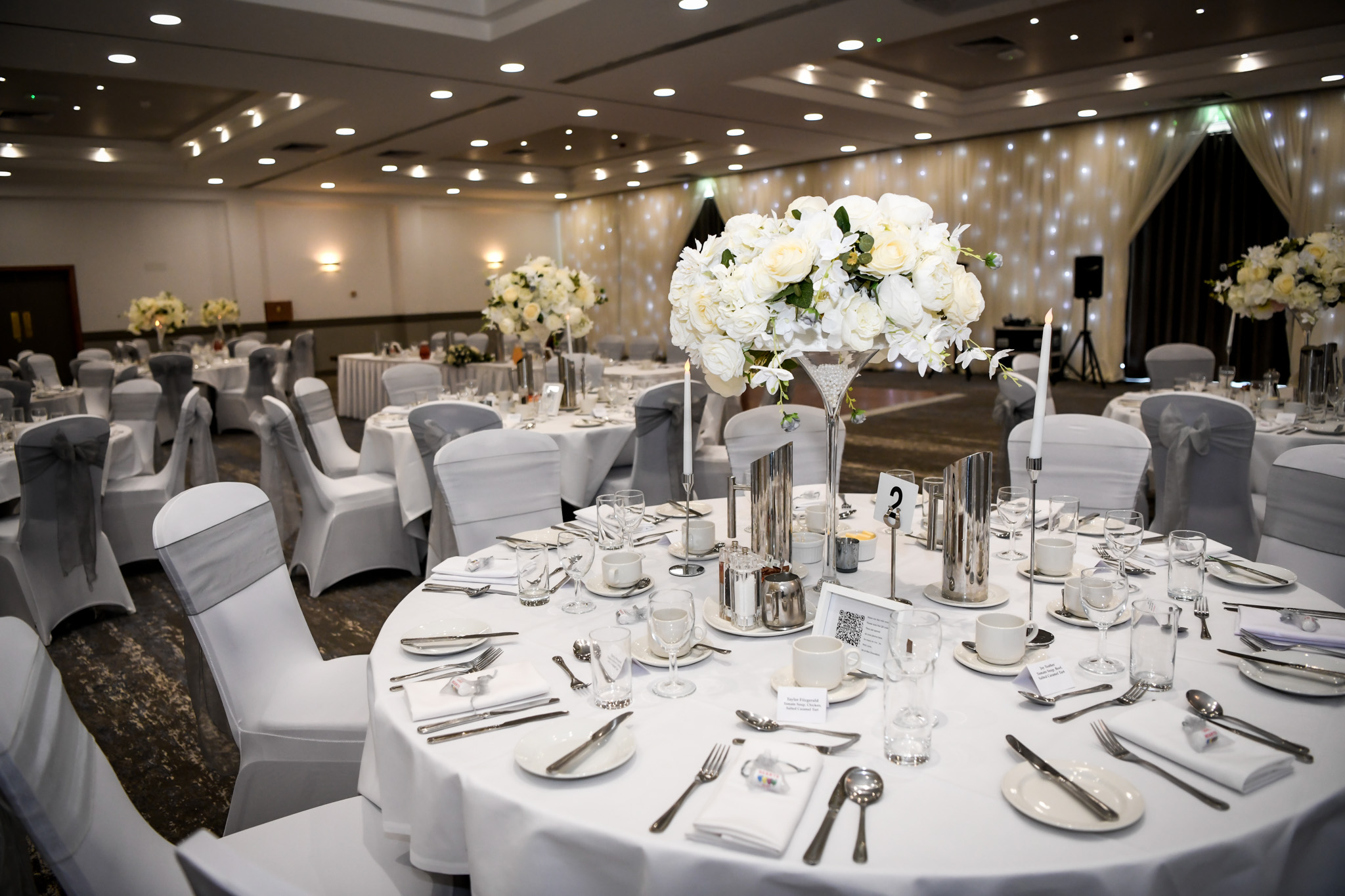Use of our in-house cake stand and knife (square or round), and table linen (White), menus, table plan, and name cards provided by the hotel, hotel uplighters on your preferred chosen colour, choice of Satin or Ruffle bows for your ceremony & wedding breakfast (subject to colour availability)