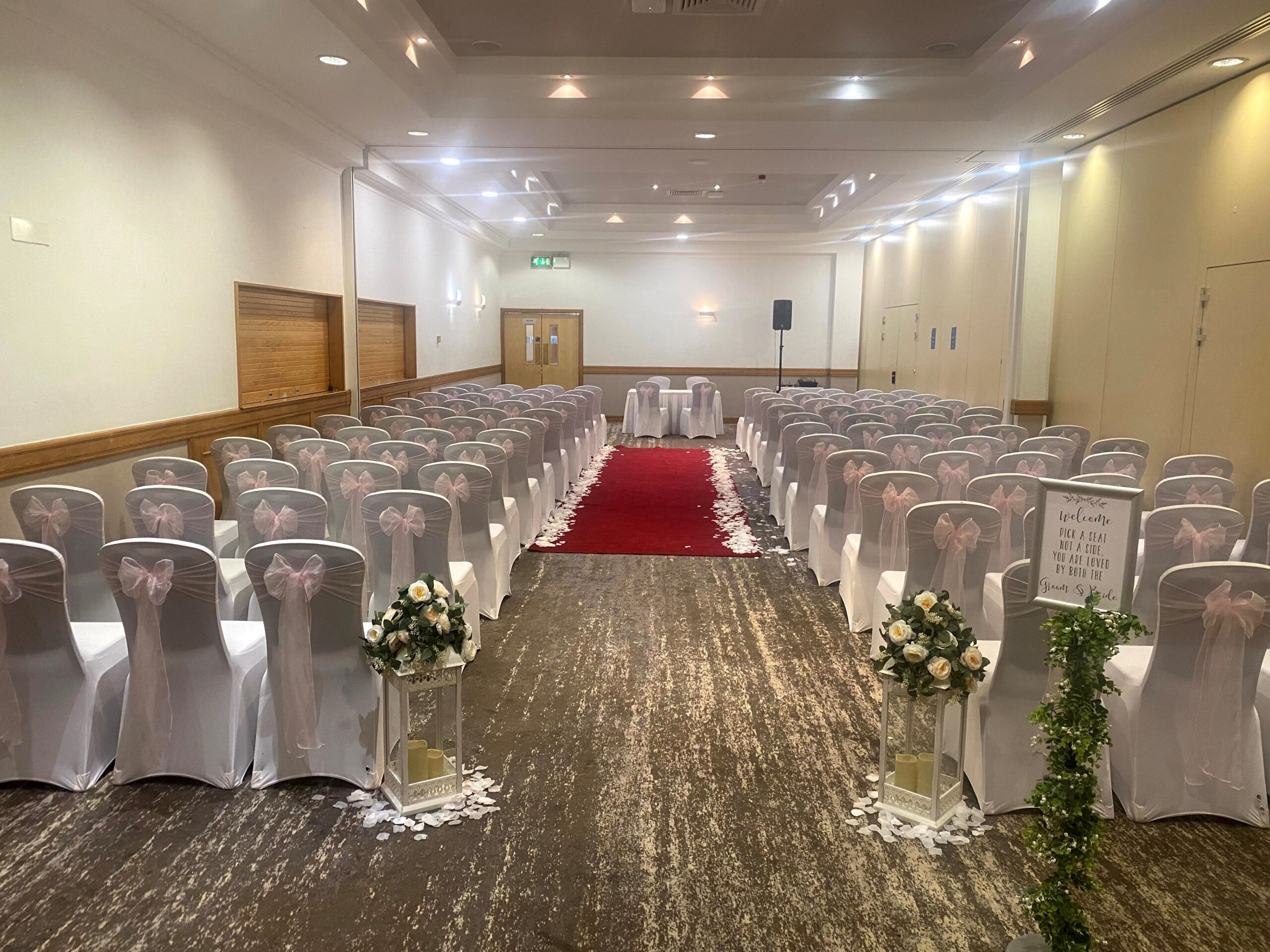 Use of our in-house cake stand and knife (square or round), hotel chair covers and table linen (White), menus, table plan, and name cards provided by the hotel, hotel uplighters on your preferred colour, choice of organza bows for your ceremony & wedding breakfast (subject to colour availability)